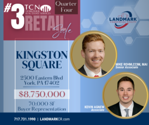 This 68,433‑square‑foot retail center earned national placement within TCN Worldwide’s Top Retail Transactions for Q4. Represented by Michael Rohm, CCIM, MAI, Senior Associate, and Kevin Agnew, Associate, the Kingston Square investment sale highlighted ongoing demand within York’s retail corridors and further demonstrated Landmark’s growing influence in the region.